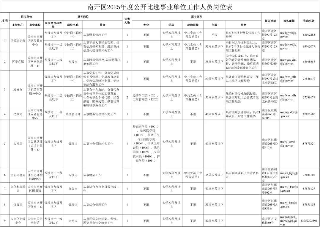 比选岗位、数量和资格条件等内容可查询《南开区2025年度公开比选事业单位工作人员岗位表》。