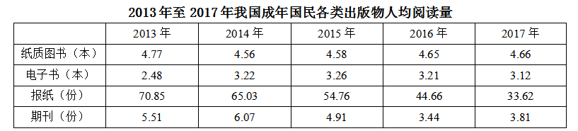 A.2013年至2017年我国成年国民人均电子书阅读量逐年上升