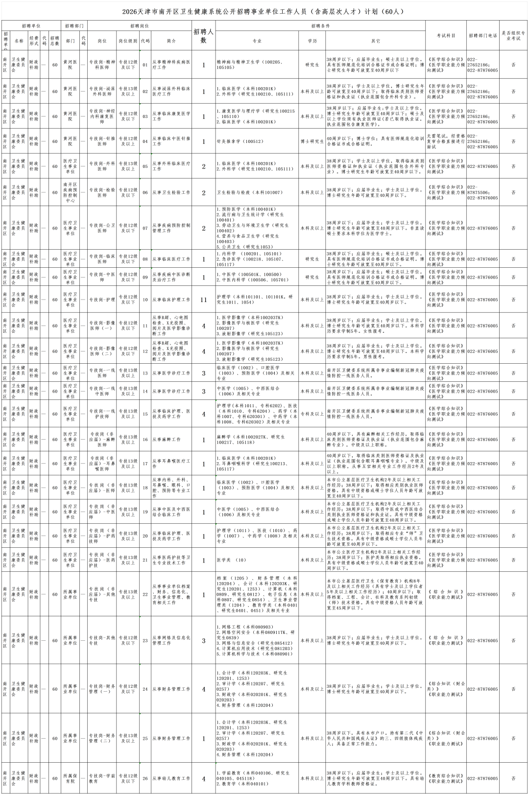 招聘各类专业技术人员共60名,具体招聘的岗位、条件及人数详见《2026年天津市南开区卫生健康系统公开招聘事业单位工作人员(含高层次人才)计划》。