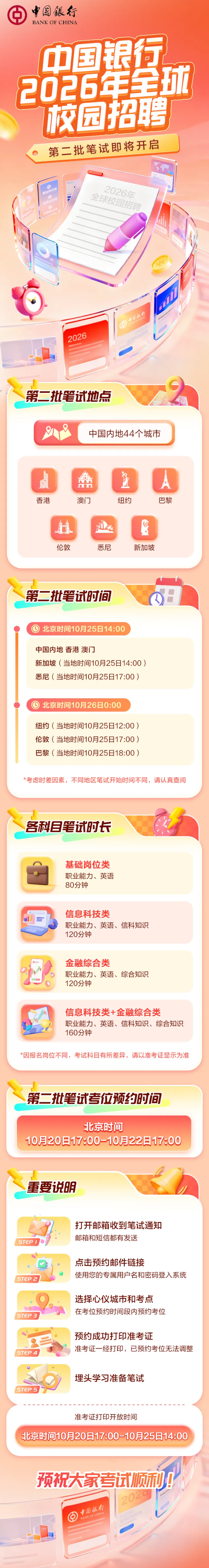 中国银行2026年全球校园招聘第二批笔试即将开启 时间:2025-10-20 13:52 来源:未知 作者:吴老师 点击:次 半月讲坛温馨提示:信息均转载自官方网站,仅供参考,不构成相关服务。其最终解释权归相关单位所有,如对信息有疑问,请直接与相关单位联系。转载目的在于信息传递,我司不承担此类稿件其他行为的连带责任,如有侵权或需删除请联系我们。因此带来的不便敬请谅解! (责任编辑:吴老师) 上一篇:中国建设银行2026年度校园招聘笔试通知 下一篇:中国银行2026年全球校园招聘统一考试考生预约考点操作说明