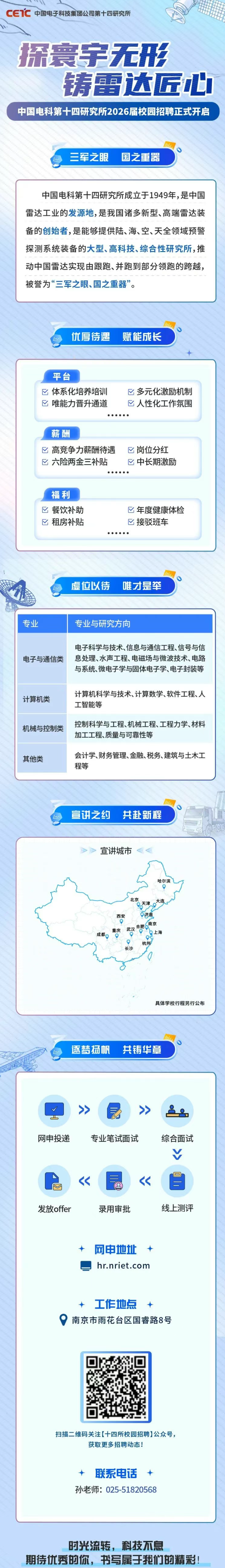 中国电科第十四研究所2026届校园招聘 时间:2026-03-31 14:55 作者:吴老师 半月讲坛温馨提示:信息均转载自官方网站,仅供参考,不构成相关服务。其最终解释权归相关单位所有,如对信息有疑问,请直接与相关单位联系。转载目的在于信息传递,我司不承担此类稿件其他行为的连带责任,如有侵权或需删除请联系我们。因此带来的不便敬请谅解! (责任编辑:吴老师) 上一篇:中国电子科技集团公司第十二研究所2026年校园招聘 下一篇:中国电科十五所2026届春季校园招聘