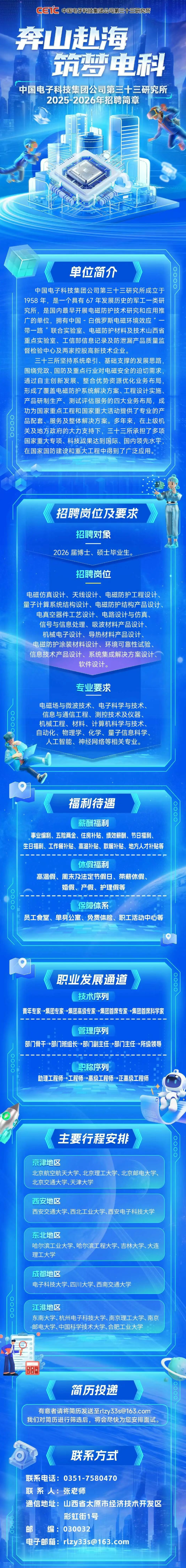 中国电子科技集团公司第三十三研究所2025-2026年招聘简章 时间:2026-03-31 15:34 作者:吴老师 半月讲坛温馨提示:信息均转载自官方网站,仅供参考,不构成相关服务。其最终解释权归相关单位所有,如对信息有疑问,请直接与相关单位联系。转载目的在于信息传递,我司不承担此类稿件其他行为的连带责任,如有侵权或需删除请联系我们。因此带来的不便敬请谅解! (责任编辑:吴老师) 上一篇:中国电子科技集团公司第三十二研究所2026届校园招聘 下一篇:中国电子科技集团公司第三十九研究所2026届校园招聘