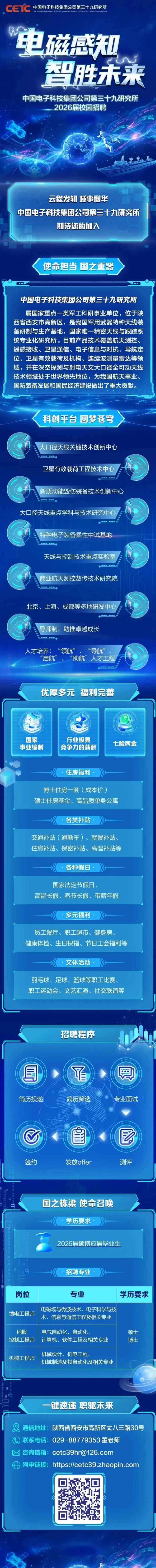 中国电子科技集团公司第三十九研究所2026届校园招聘 时间:2026-03-31 15:36 作者:吴老师 半月讲坛温馨提示:信息均转载自官方网站,仅供参考,不构成相关服务。其最终解释权归相关单位所有,如对信息有疑问,请直接与相关单位联系。转载目的在于信息传递,我司不承担此类稿件其他行为的连带责任,如有侵权或需删除请联系我们。因此带来的不便敬请谅解! (责任编辑:吴老师) 上一篇:中国电子科技集团公司第三十三研究所2025-2026年招聘简章 下一篇:中国航空发动机集团有限公司2026届校园招聘