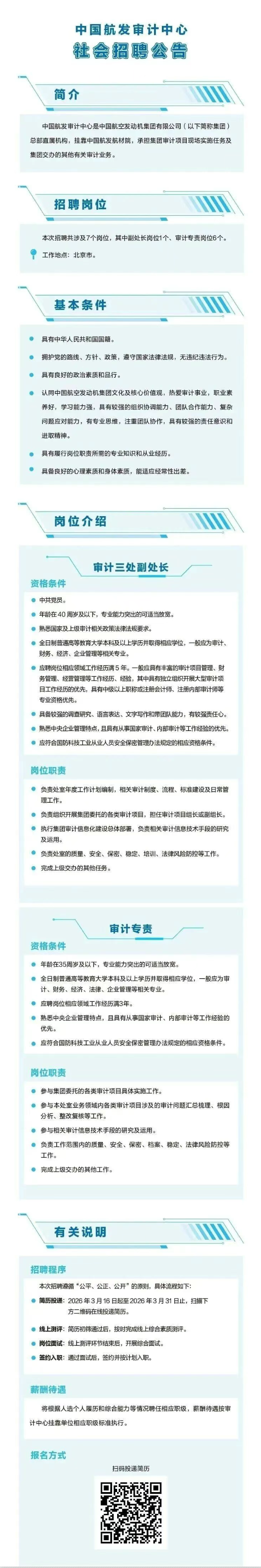 中国航发审计中心社会招聘公告 时间:2026-03-31 15:56 作者:吴老师 半月讲坛温馨提示:信息均转载自官方网站,仅供参考,不构成相关服务。其最终解释权归相关单位所有,如对信息有疑问,请直接与相关单位联系。转载目的在于信息传递,我司不承担此类稿件其他行为的连带责任,如有侵权或需删除请联系我们。因此带来的不便敬请谅解! (责任编辑:吴老师) 上一篇:中国航空发动机集团有限公司2026届校园招聘 下一篇:中国航发燃机2026届毕业生春季校园招聘