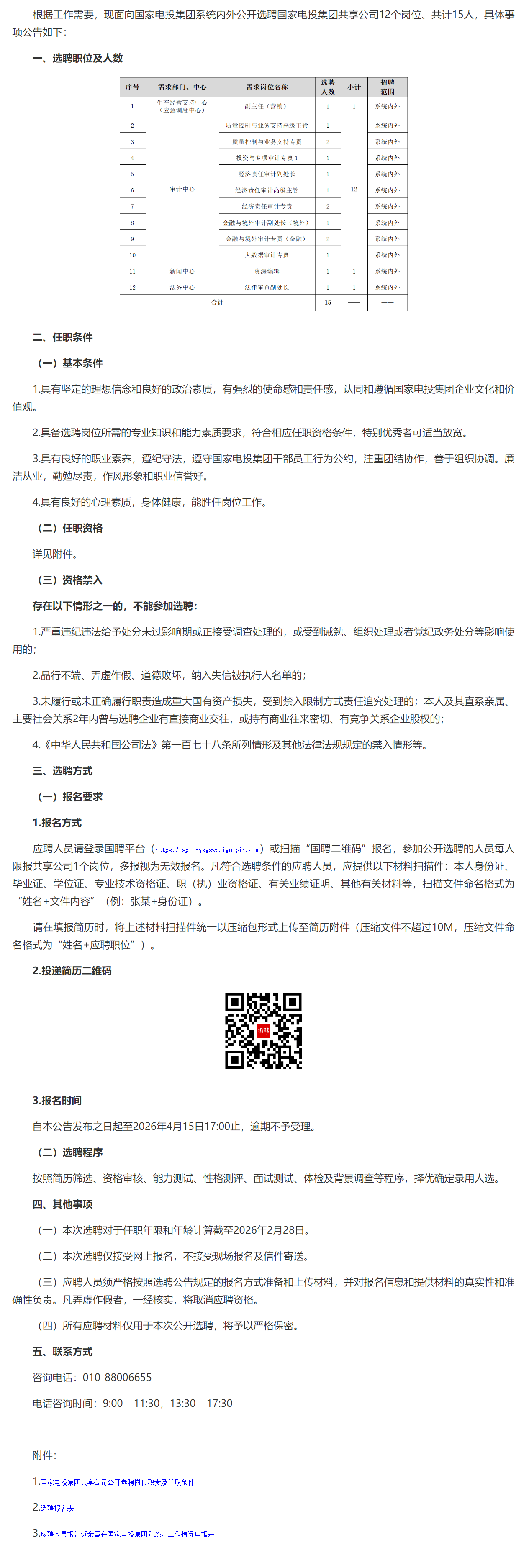国家电投集团共享公司人员公开选聘公告 时间:2026-04-13 11:38 作者:吴老师 附件: 1.国家电投集团共享公司公开选聘岗位职责及任职条件 2.选聘报名表 3.应聘人员报告近亲属在国家电投集团系统内工作情况申报表 半月讲坛温馨提示:信息均转载自官方网站,仅供参考,不构成相关服务。其最终解释权归相关单位所有,如对信息有疑问,请直接与相关单位联系。转载目的在于信息传递,我司不承担此类稿件其他行为的连带责任, 如有侵权或需删除请联系我们。因此带来的不便敬请谅解! (责任编辑:吴老师) 上一篇:中车永济电机公司2026年校园招聘 下一篇:中国广播影视出版社有限公司2026年度高校毕业生公开招聘公告