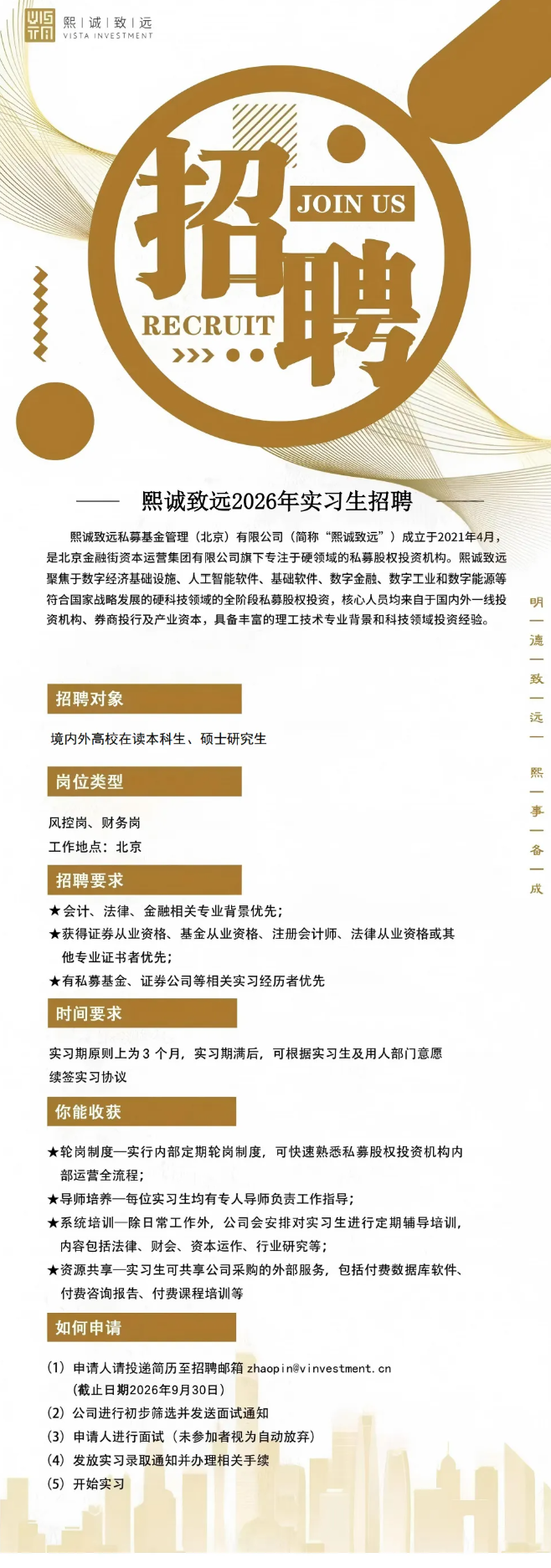 熙诚致远2026年实习生招聘 时间:2026-04-14 14:16 作者:吴老师 半月讲坛温馨提示:信息均转载自官方网站,仅供参考,不构成相关服务。其最终解释权归相关单位所有,如对信息有疑问,请直接与相关单位联系。转载目的在于信息传递,我司不承担此类稿件其他行为的连带责任,如有侵权或需删除请联系我们。因此带来的不便敬请谅解! (责任编辑:吴老师) 上一篇:航空工业信息技术中心(金航数码)2026年度实习生招聘 下一篇:中电科半导体材料有限公司公开招聘公告