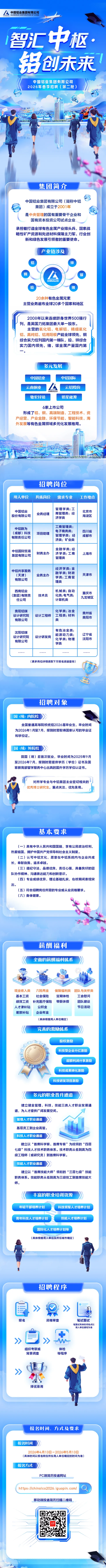 中国铝业集团有限公司2026年春季招聘(第二批) 时间:2026-04-15 16:37 作者:吴老师 半月讲坛温馨提示:信息均转载自官方网站,仅供参考,不构成相关服务。其最终解释权归相关单位所有,如对信息有疑问,请直接与相关单位联系。转载目的在于信息传递,我司不承担此类稿件其他行为的连带责任,如有侵权或需删除请联系我们。因此带来的不便敬请谅解! (责任编辑:吴老师) 上一篇:国机集团2026届春季校园招聘 下一篇:中国南方电网有限责任公司2026年第一批高层次人才引进公告