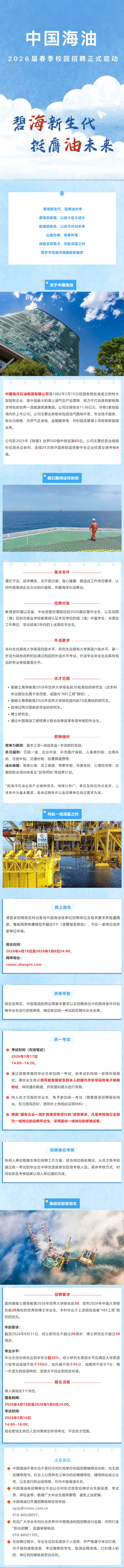 中国海油天津招聘公告发布 时间:2026-04-20 14:58 作者:吴老师 半月讲坛温馨提示:信息均转载自官方网站,仅供参考,不构成相关服务。其最终解释权归相关单位所有,如对信息有疑问,请直接与相关单位联系。转载目的在于信息传递,我司不承担此类稿件其他行为的连带责任,如有侵权或需删除请联系我们。因此带来的不便敬请谅解! (责任编辑:吴老师) 上一篇:天津市静海区公共就业(人才)服务中心招募就业见习人员公告 下一篇:天津津滨威立雅水业有限公司2026年度人才引进招聘公告