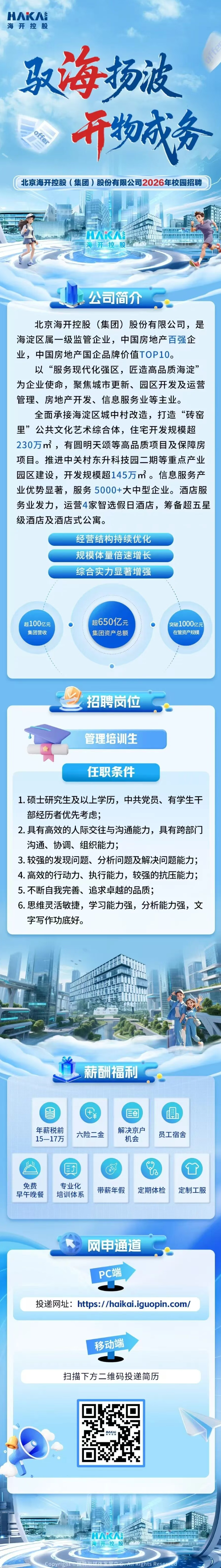北京海开控股(集团)股份有限公司2026年校园招聘 时间:2026-04-21 10:39 作者:吴老师 半月讲坛温馨提示:信息均转载自官方网站,仅供参考,不构成相关服务。其最终解释权归相关单位所有,如对信息有疑问,请直接与相关单位联系。转载目的在于信息传递,我司不承担此类稿件其他行为的连带责任,如有侵权或需删除请联系我们。因此带来的不便敬请谅解! (责任编辑:吴老师) 上一篇:天津市西青经开区投资促进有限公司公开招聘产投专员公告 下一篇:中国矿产资源集团总部及所属单位2026年社会招聘