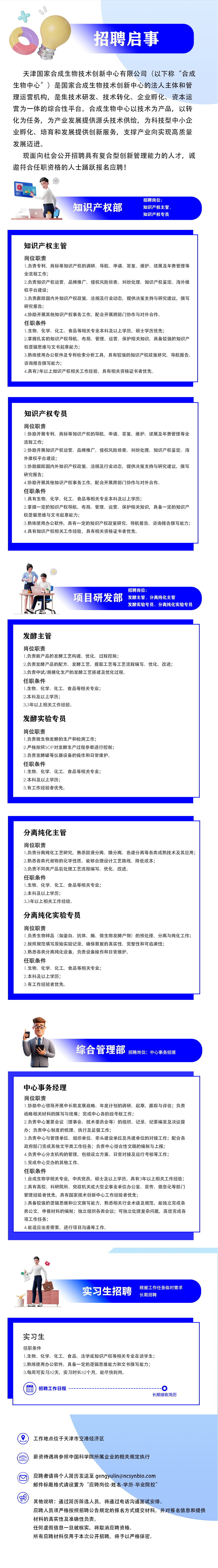 天津国家合成生物技术创新中心有限公司招聘启事 时间:2026-04-22 10:24 作者:吴老师 半月讲坛温馨提示:信息均转载自官方网站,仅供参考,不构成相关服务。其最终解释权归相关单位所有,如对信息有疑问,请直接与相关单位联系。转载目的在于信息传递,我司不承担此类稿件其他行为的连带责任,如有侵权或需删除请联系我们。因此带来的不便敬请谅解! (责任编辑:吴老师) 上一篇:天津滨海新区科技金融投资集团有限公司及所属子公司2026年公开招聘公告 下一篇:国机重型装备集团股份有限公司2026届春季校园招聘公告