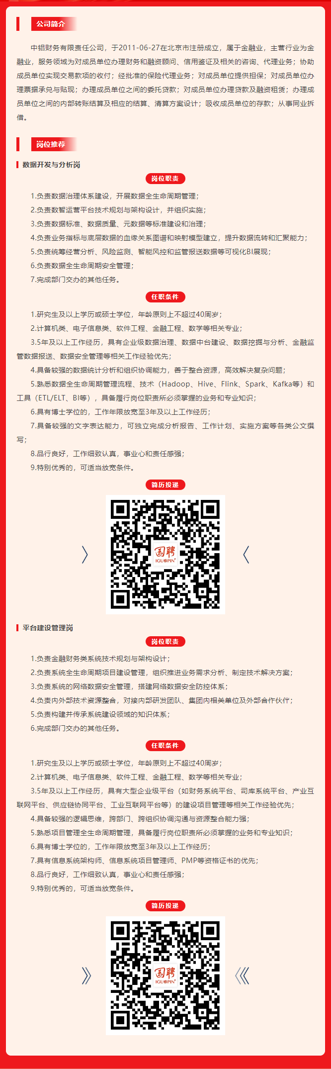 中铝财务有限责任公司社招岗位推荐 时间:2026-04-24 15:21 作者:吴老师 半月讲坛温馨提示:信息均转载自官方网站,仅供参考,不构成相关服务。其最终解释权归相关单位所有,如对信息有疑问,请直接与相关单位联系。转载目的在于信息传递,我司不承担此类稿件其他行为的连带责任,如有侵权或需删除请联系我们。因此带来的不便敬请谅解! (责任编辑:吴老师) 上一篇:《中国石油和化工》杂志融媒体编辑招聘 下一篇:中信建投证券2026年暑期实习生招聘