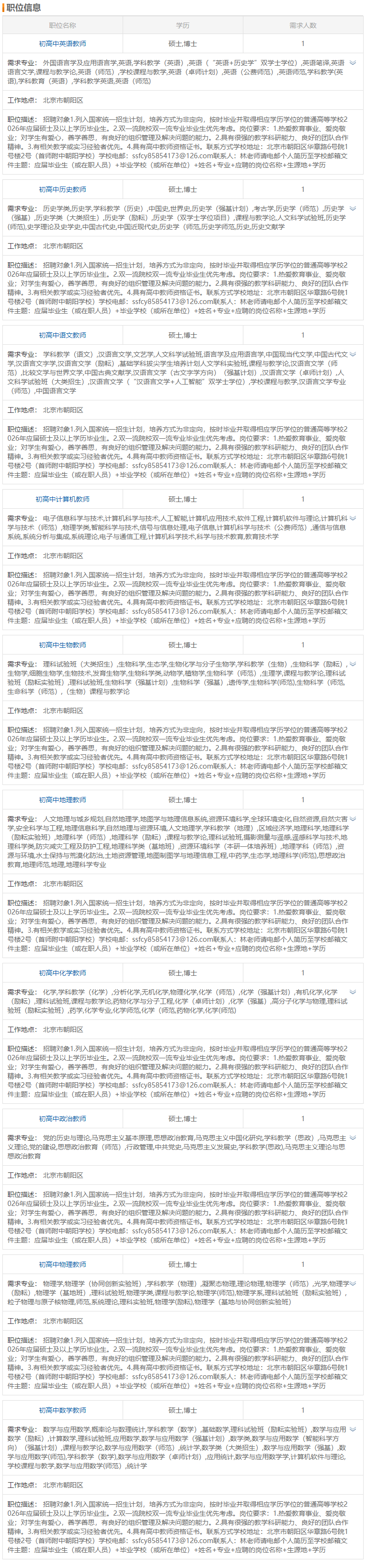 首都师范大学附属中学朝阳学校2026届毕业生招聘