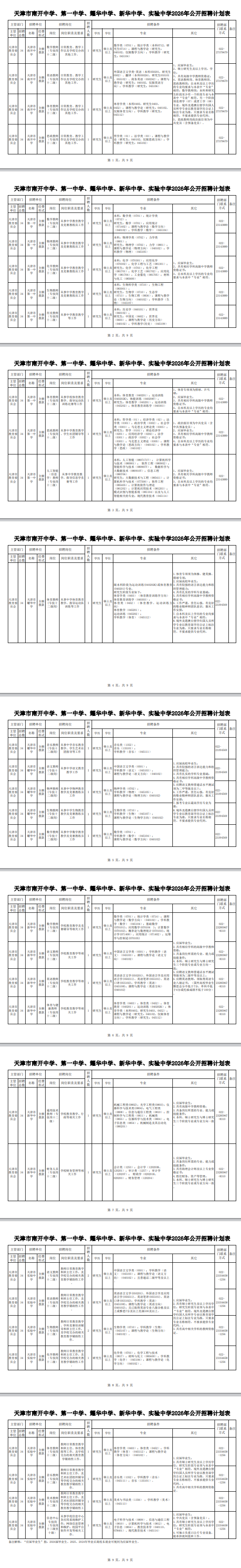 招聘单位、岗位名称、招聘条件、联系方式等信息详见《天津市南开中学、第一中学、耀华中学、新华中学、实验中学 2026 年公开招聘计划表》(附件 1)。
