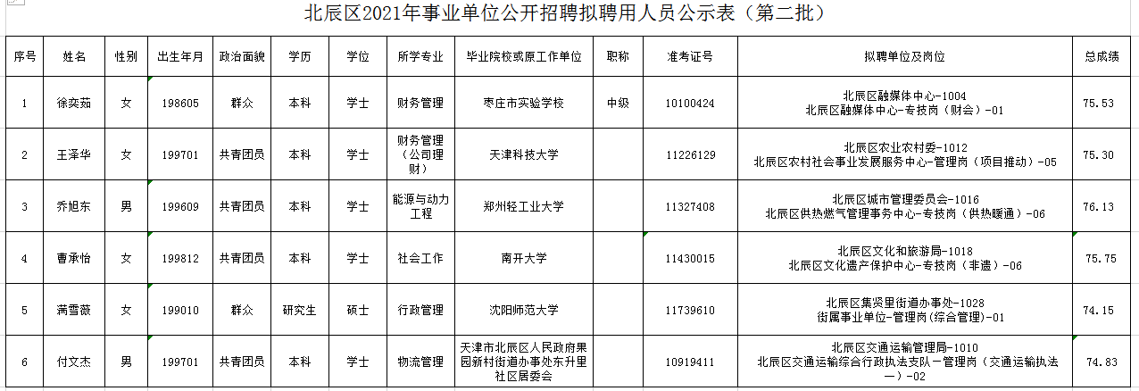 天津市北辰区2021年事业单位公开招聘工作人员,经报名、笔试、面试、体检、考察等环节,第二批共计6人符合条件,按照《天津市北辰区2021年事业单位公开招聘工作人员公告》,现将第二批拟聘用人员予以公示。