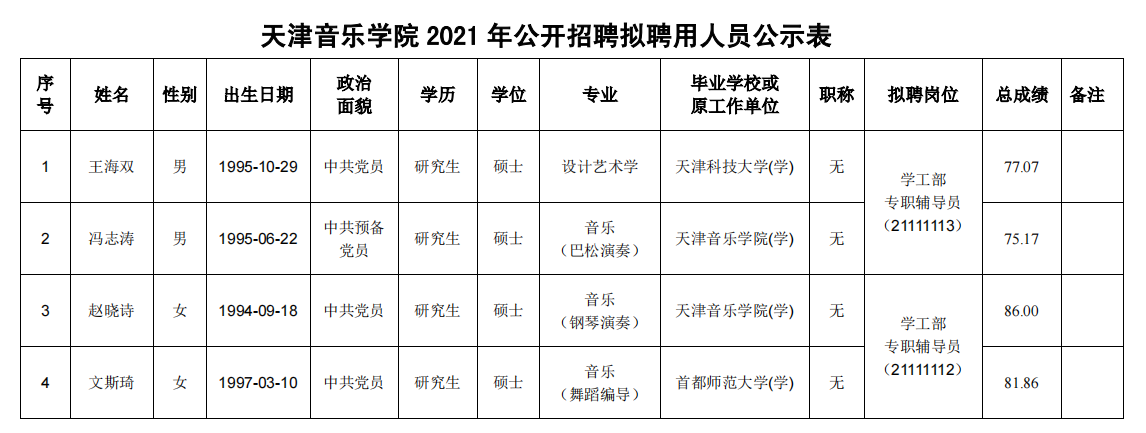天津音乐学院2021年公开招聘-通知29(辅导员岗位拟聘用人员公示)