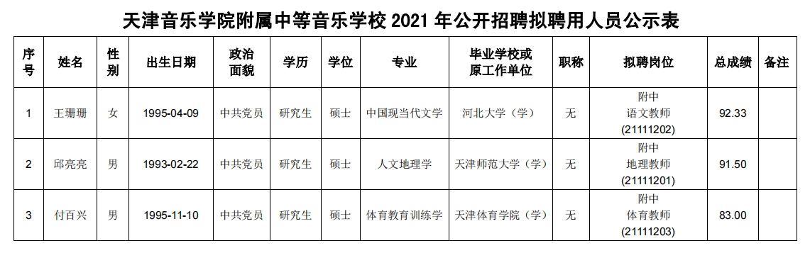天津音乐学院附属中等音乐学校2021年公开招聘-通知15(拟聘用人员公示)