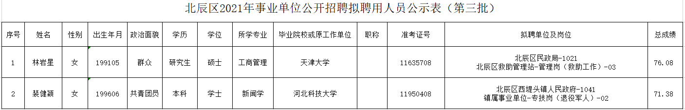 天津市北辰区2021年事业单位公开招聘工作人员,经报名、笔试、面试、体检、考察等环节,第三批共计2人符合条件,按照《天津市北辰区2021年事业单位公开招聘工作人员公告》,现将第三批拟聘用人员予以公示。