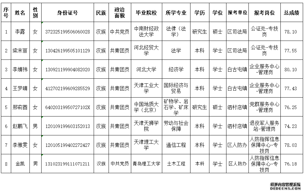 武清区2021年第二批事业单位公开招聘工作人员,经报名、笔试、面试、体检、考察等环节,共计8人符合条件,按照《武清区2021年事业单位公开招聘工作人员公告》,现将拟聘用人员予以公示。