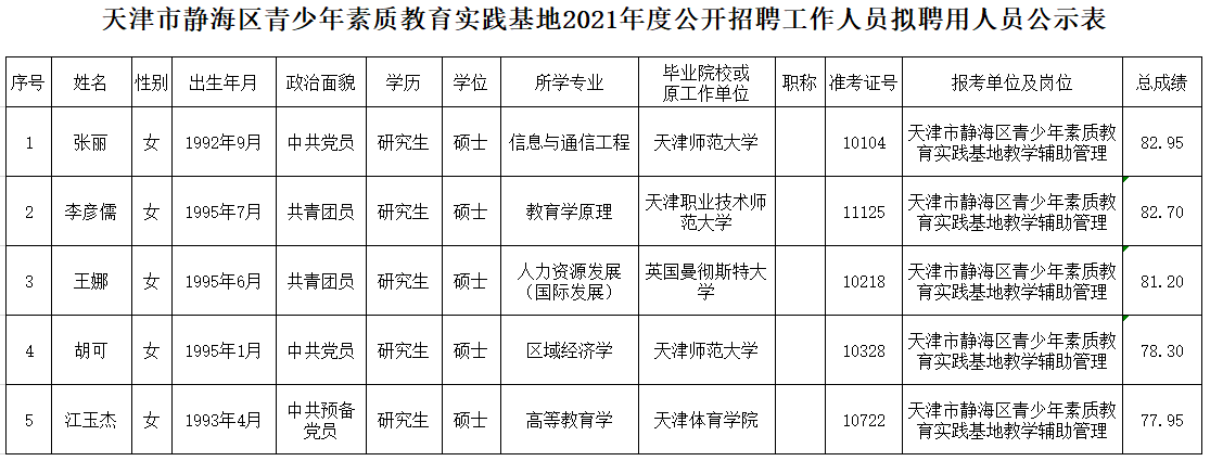 天津市静海区青少年素质教育实践基地2021年度公开招聘工作人员拟聘用人员公示