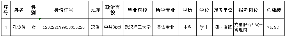 武清区2021年第三批事业单位公开招聘工作人员,经报名、笔试、面试、体检、考察等环节,共计1人符合条件,按照《武清区2021年事业单位公开招聘工作人员公告》,现将拟聘用人员予以公示。