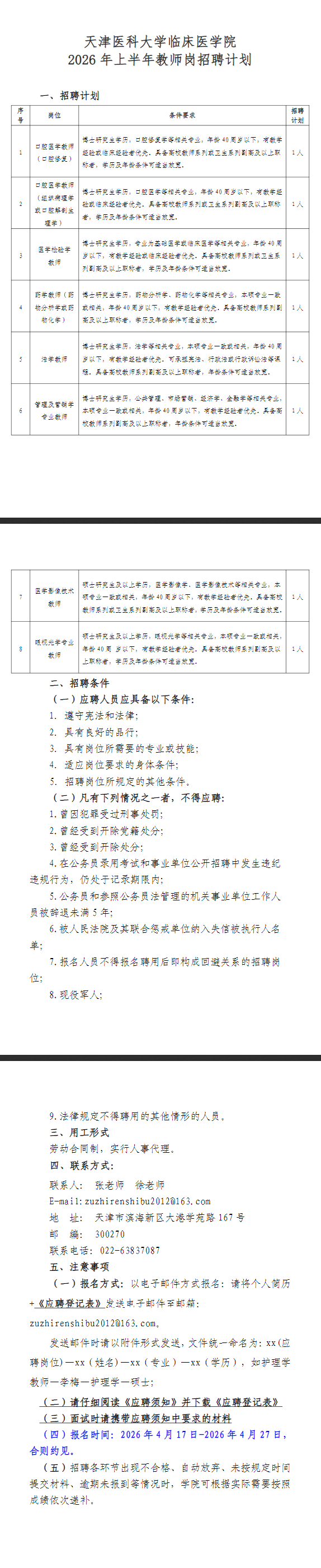 天津医科大学临床医学院2026年上半年教师岗招聘计划