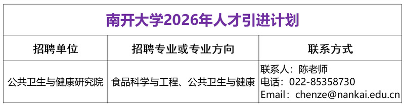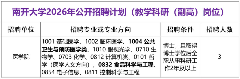 2026年南开大学公共卫生与健康研究院教学科研(副高)岗位公开招聘、全职人才引进、博士后招收公告