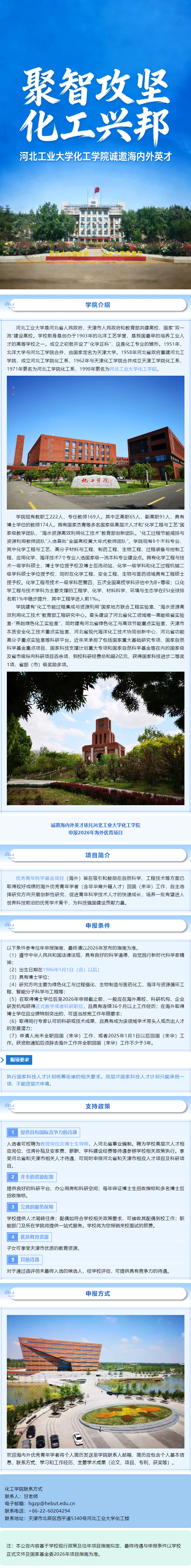 河北工业大学化工学院诚邀海内外英才 时间:2026-01-28 09:38 来源:未知 作者:吴老师 点击:次 半月讲坛温馨提示:信息均转载自官方网站,仅供参考,不构成相关服务。其最终解释权归相关单位所有,如对信息有疑问,请直接与相关单位联系。转载目的在于信息传递,我司不承担此类稿件其他行为的连带责任,如有侵权或需删除请联系我们。因此带来的不便敬请谅解! (责任编辑:吴老师) 上一篇:2026年南开大学公共卫生与健康研究院教学科研(副高)岗位公开招聘、全职人才引进、博士后招收公告 下一篇:河北中医药大学2026年公开选聘工作人员公告