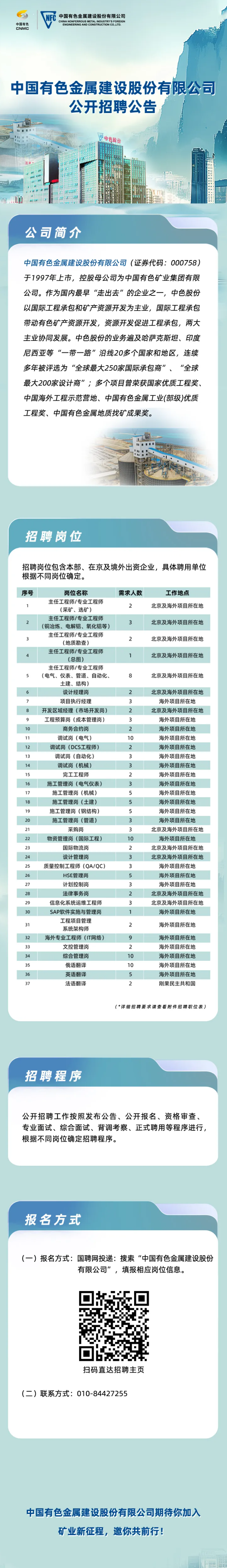 中国有色金属建设股份有限公司公开招聘公告 时间:2026-03-24 11:22 作者:吴老师 附件:2026年社会公开招聘岗位列表.pdf 半月讲坛温馨提示:信息均转载自官方网站,仅供参考,不构成相关服务。其最终解释权归相关单位所有,如对信息有疑问,请直接与相关单位联系。转载目的在于信息传递,我司不承担此类稿件其他行为的连带责任, 如有侵权或需删除请联系我们。因此带来的不便敬请谅解! (责任编辑:吴老师) 上一篇:天津市勘察设计院集团有限公司2025-2026招聘公告 下一篇:北京大学京津冀生物医学前沿创新中心招聘启事