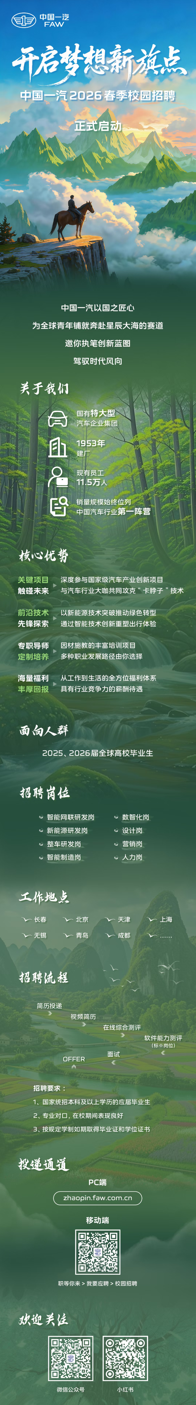 中国一汽2026春季校园招聘 时间:2026-04-01 09:25 作者:吴老师 半月讲坛温馨提示:信息均转载自官方网站,仅供参考,不构成相关服务。其最终解释权归相关单位所有,如对信息有疑问,请直接与相关单位联系。转载目的在于信息传递,我司不承担此类稿件其他行为的连带责任,如有侵权或需删除请联系我们。因此带来的不便敬请谅解! (责任编辑:吴老师) 上一篇:北京市大兴区旧宫镇人民政府面向社会公开招聘劳务派遣人员公告 下一篇:中国一汽研发总院2026春季校园招聘