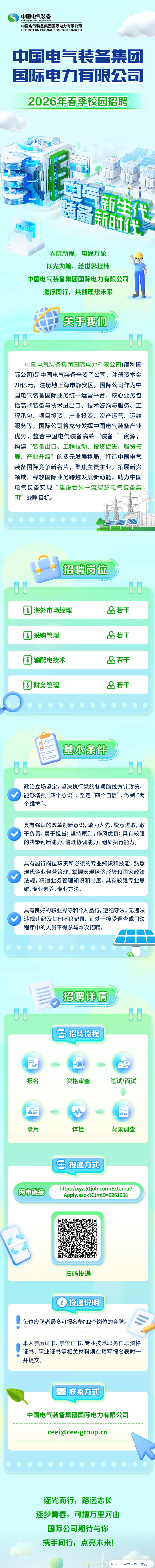 中国电气装备集团国际电力有限公司2026年春季校园招聘 时间:2026-04-01 11:47 作者:吴老师 半月讲坛温馨提示:信息均转载自官方网站,仅供参考,不构成相关服务。其最终解释权归相关单位所有,如对信息有疑问,请直接与相关单位联系。转载目的在于信息传递,我司不承担此类稿件其他行为的连带责任,如有侵权或需删除请联系我们。因此带来的不便敬请谅解! (责任编辑:吴老师) 上一篇:中国电气装备集团招聘 下一篇:中国电气装备储能公司2026年度春季校园招聘