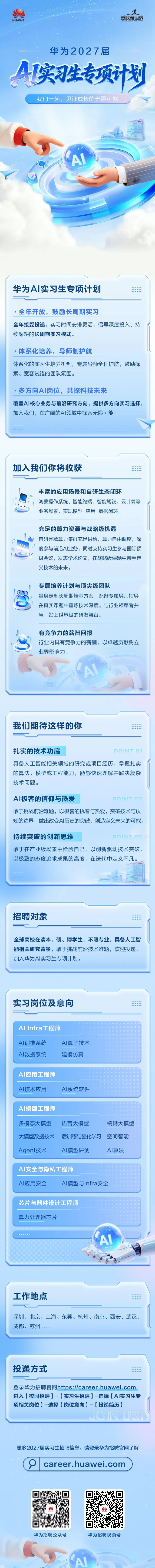 华为2027届AI实习生专项计划正式启动 时间:2026-04-01 14:05 作者:吴老师 半月讲坛温馨提示:信息均转载自官方网站,仅供参考,不构成相关服务。其最终解释权归相关单位所有,如对信息有疑问,请直接与相关单位联系。转载目的在于信息传递,我司不承担此类稿件其他行为的连带责任,如有侵权或需删除请联系我们。因此带来的不便敬请谅解! (责任编辑:吴老师) 上一篇:北京空间机电研究所2026年校园招聘 下一篇:中建三局总承包公司2026春季校园招聘