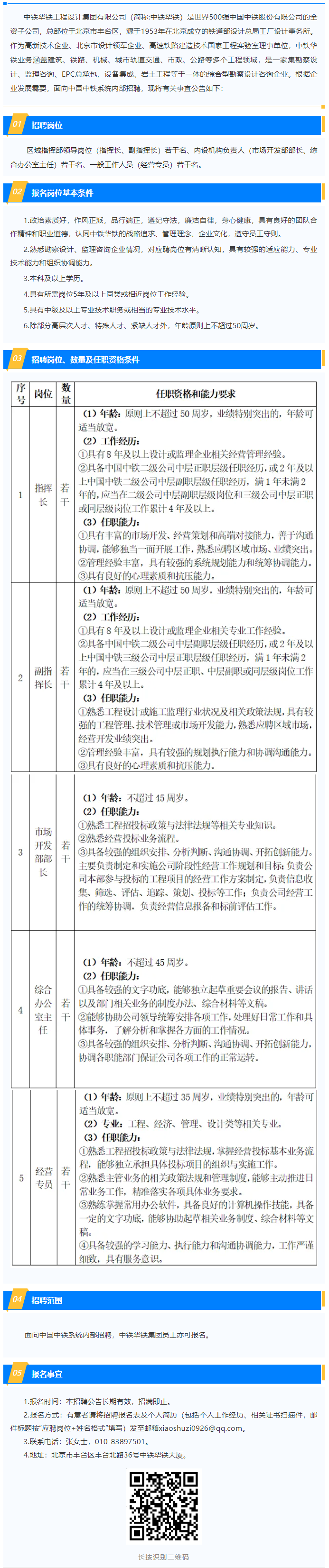 中铁华铁工程设计集团有限公司区域指挥部招聘公告 时间:2026-04-08 16:25 作者:吴老师 半月讲坛温馨提示:信息均转载自官方网站,仅供参考,不构成相关服务。其最终解释权归相关单位所有,如对信息有疑问,请直接与相关单位联系。转载目的在于信息传递,我司不承担此类稿件其他行为的连带责任,如有侵权或需删除请联系我们。因此带来的不便敬请谅解! (责任编辑:吴老师) 上一篇:北京国际大数据交易所有限责任公司所属企业招聘公告 下一篇:中铁华铁工程设计集团有限公司本部招聘公告
