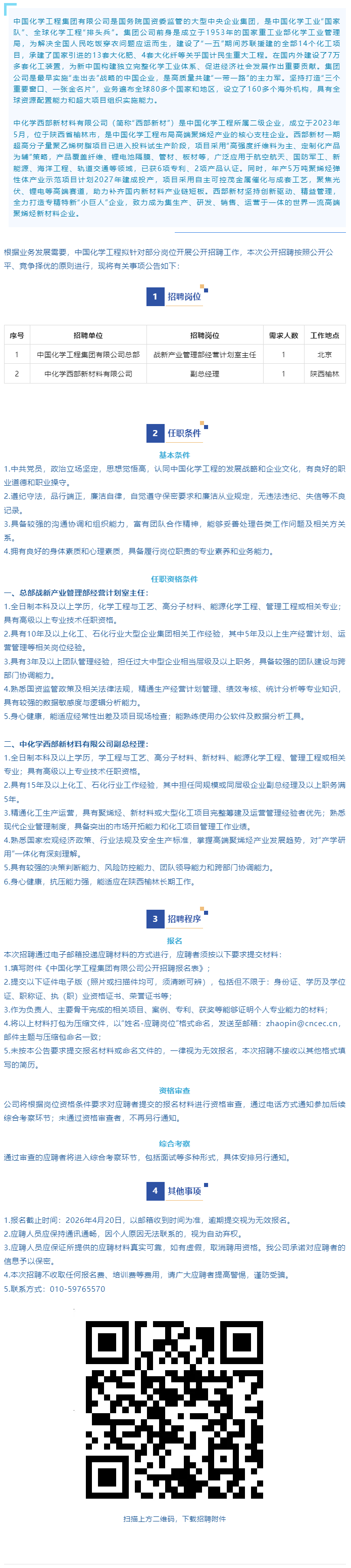 中国化学工程集团有限公司招聘公告 时间:2026-04-09 09:32 作者:吴老师 半月讲坛温馨提示:信息均转载自官方网站,仅供参考,不构成相关服务。其最终解释权归相关单位所有,如对信息有疑问,请直接与相关单位联系。转载目的在于信息传递,我司不承担此类稿件其他行为的连带责任,如有侵权或需删除请联系我们。因此带来的不便敬请谅解! (责任编辑:吴老师) 上一篇:天津天保控股有限公司2026年面向社会公开招聘公告 下一篇:天津泰达人才外包人员招聘(服务中新天津生态城某大型央企)